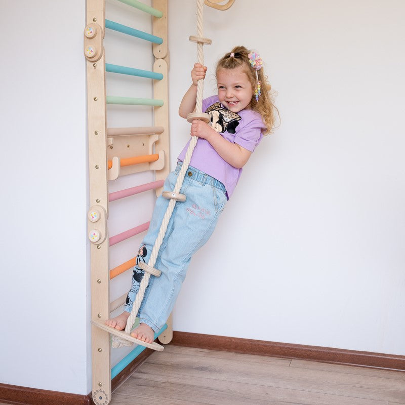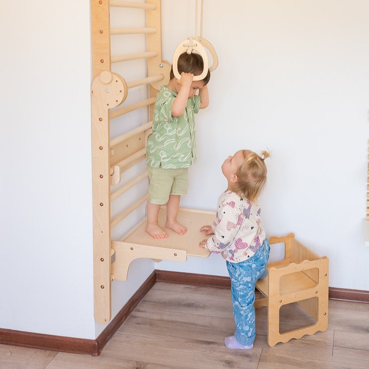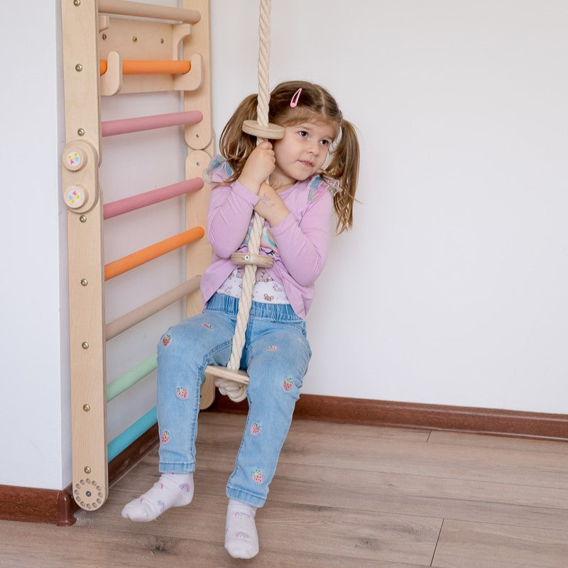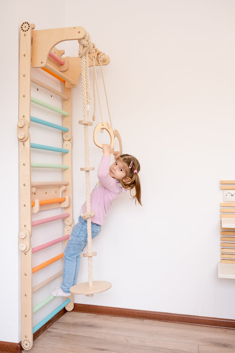 Wenn Sie das faltbare Pikler-Dreieck bereits erworben haben, können Sie es ganz einfach aufrüsten – mit unserem Wandmontage-Set verwandelt es sich in eine kompakte schwedische Wandhalterung: „ Wandmontage-Set für faltbares Pikler-Dreieck “