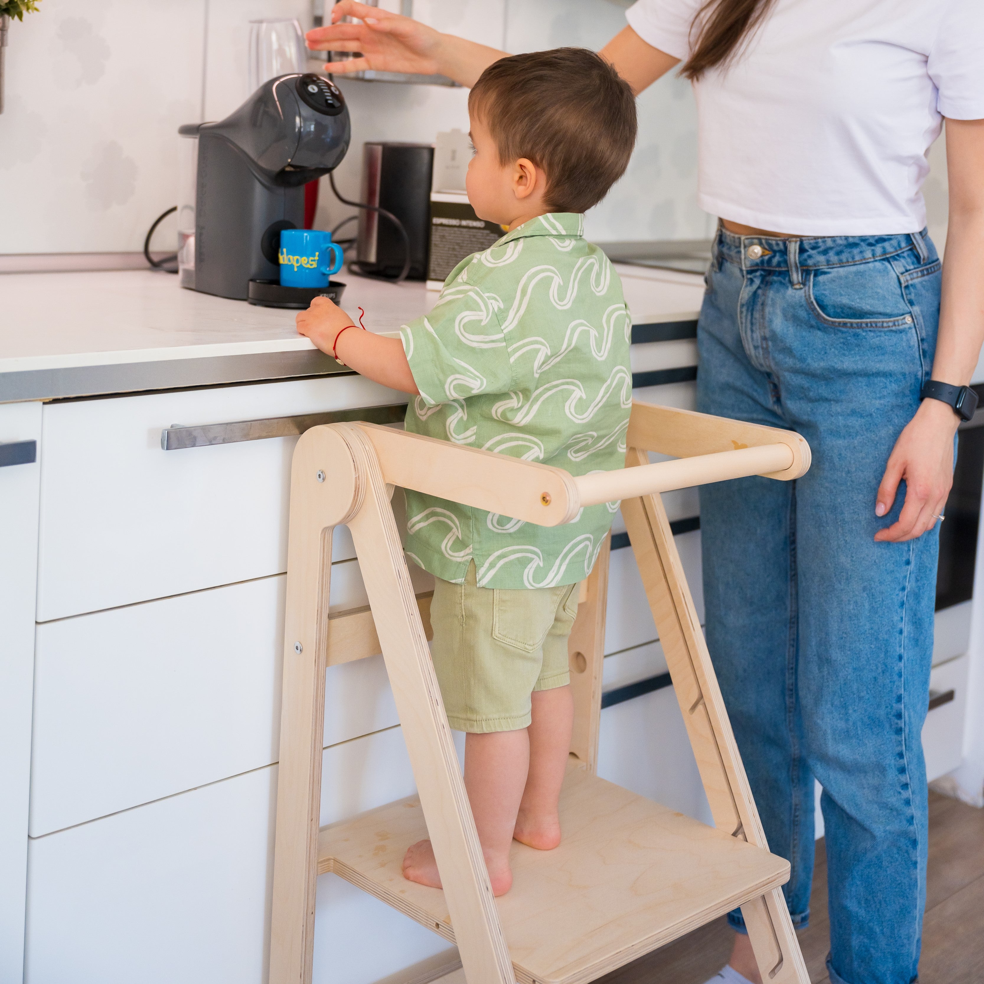 Unser Lernturm wurde entwickelt, um die Entwicklung Ihres Kindes vom Kleinkind- bis zum Vorschulalter zu fördern. Dieser vielseitige Lernturm vereint die Praktikabilität eines faltbaren Gestells mit dem zusätzlichen Vorteil der Höhenverstellung. Ob Ihr Kind in der Küche hilft, Zähne putzt oder neue Abläufe erkundet – mit diesem vielseitigen Turm werden alltägliche Aufgaben sicher, spielerisch und interaktiv gestaltet.