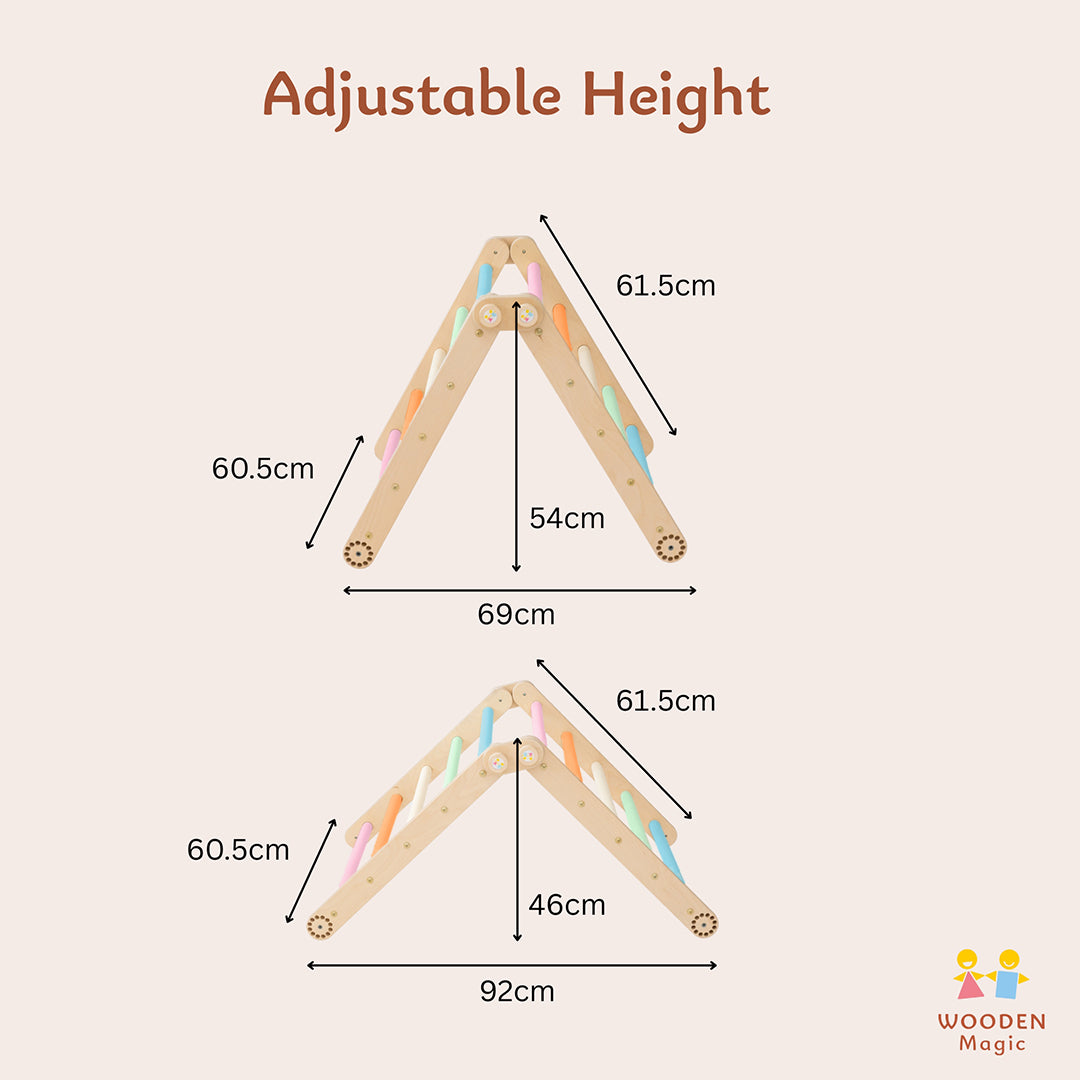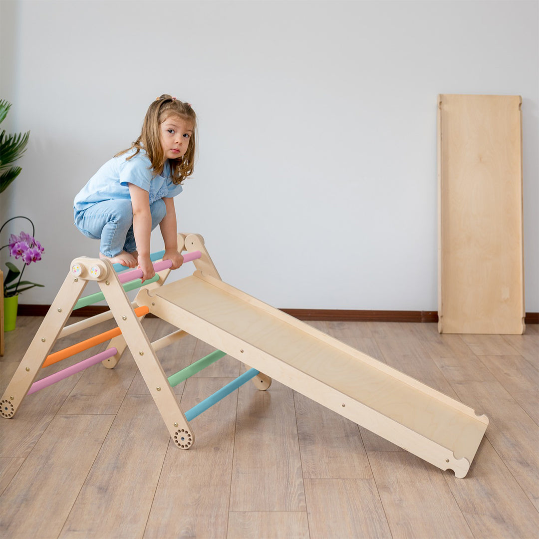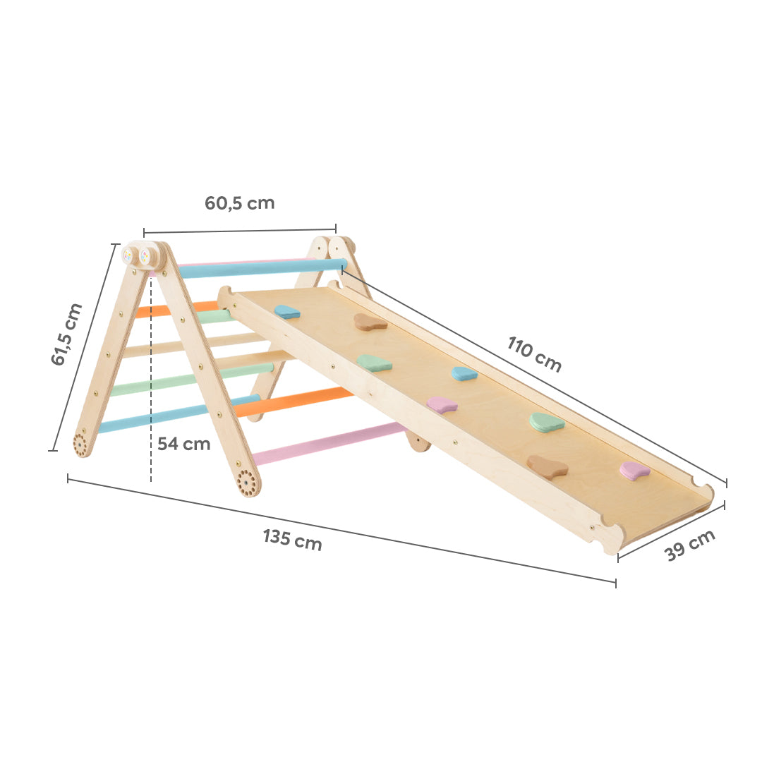 Aber das ist noch nicht alles – unser Kletterdreieck verfügt über eine doppelseitige Rampe, die für noch mehr Spielspaß und Abwechslung sorgt! Eine Seite kann zum Rutschen und die andere zum Klettern genutzt werden.